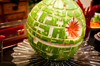 Death Star watermelon: All you need is a rounded watermelon and a carving knife, and you're in business. Carefully carve out the grid-like pattern of the Death Star I, and be sure to include the sentinel base's equator and cut out a deep hole in the melon for the superlaser. It will be a shame to slice into such a work of art, but remember it's evil and must be destroyed. Plus, your R2-D2 serving plates are waiting.